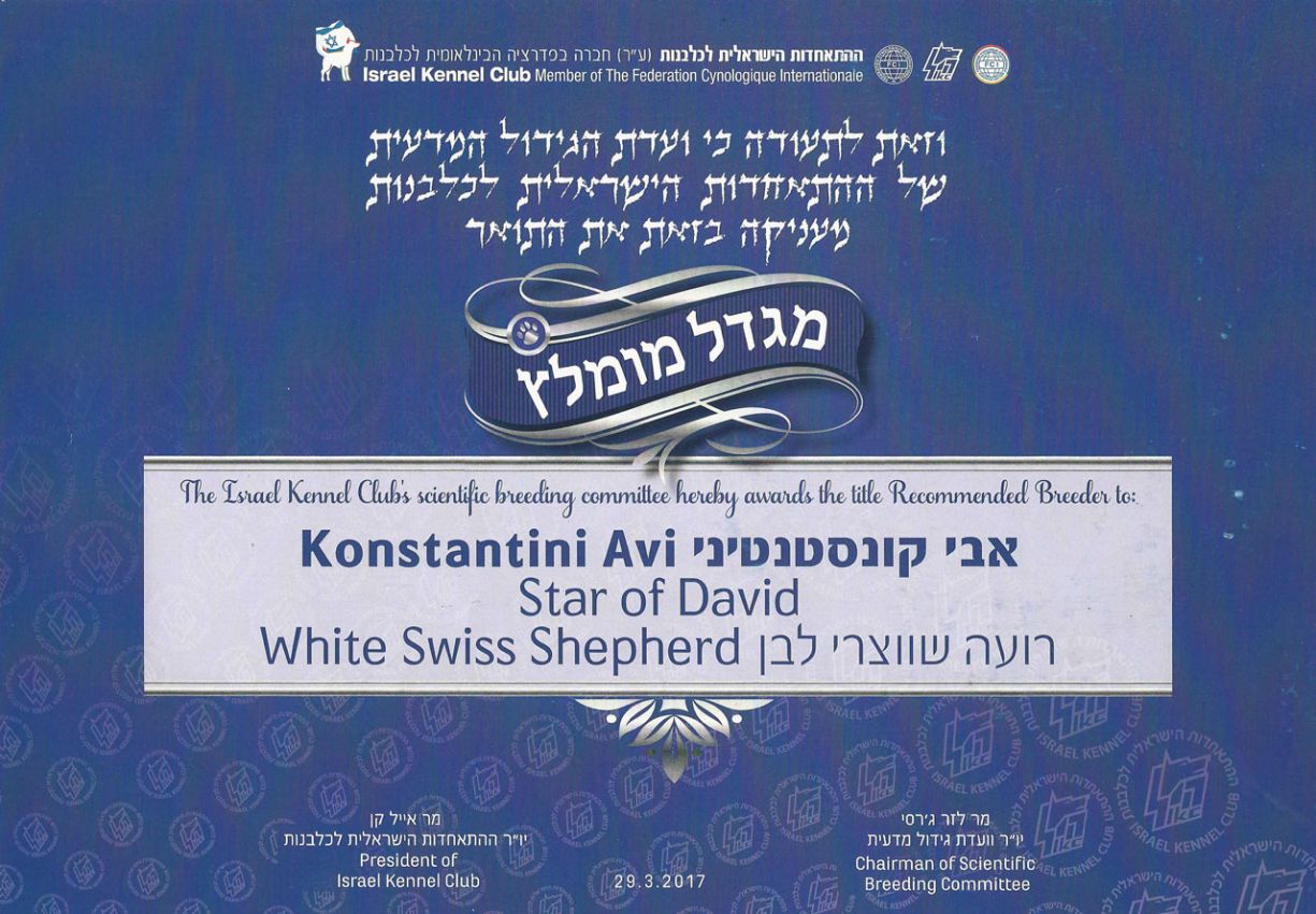 במהלך אותם השנים, אנו זוכים פעם אחר פעם בכלב השנה בגזע כלב רועים שוויצרי לבן מטעם ההתאחדות הישראלית לכלבנות. וכמו כן מקבלים את התואר מגדל מומלץ ומצטיין לגזע.